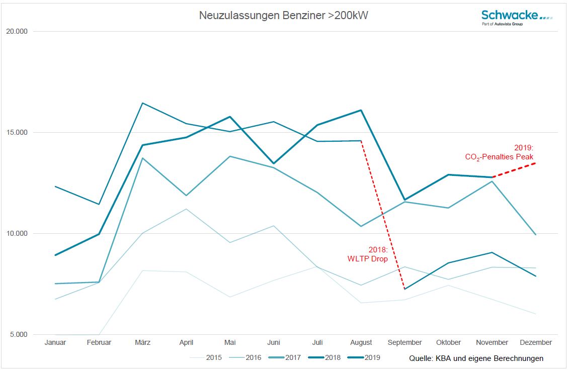 Betrachtet man als Beispiel die benzingetriebenen PKW mit mehr als 200kW (ca. 272PS), also salopp gesagt die „CO2-Bad Guys“, dann stellt man in den Monatsverläufen zunächst fest, dass von Jahr zu Jahr die Mengen wachsen. Das Linienniveau schraubt sich stetig nach oben. Zugegeben, seit 2001 hat sich die Anzahl der mit einer solchen Motorleistung zugelassenen Modellreihen von damals etwa 40 auf heute 190 vervielfacht. Aber seit 2014 liegt die Anzahl deutlich und stabil über 180. Eine steigende Vielfalt solcher Fahrzeuge würde also nicht den untypisch nach oben weisenden Wechsel von November zum Rekordwert Dezember 2019 erklären. Viel eher sehen wir hier bewusste Eingriffe durch Zulassungen CO2-problematischer Modelle, die noch schnell im nicht strafbewehrten Jahr 2019 getätigt wurden. Solche Eingriffe und Veränderungen entweder seitens der Industrie oder initiiert durch staatliche Maßnahmen werden wir in Zukunft also vermutlich noch häufiger sehen und in Marktbeobachtungen einbeziehen müssen.