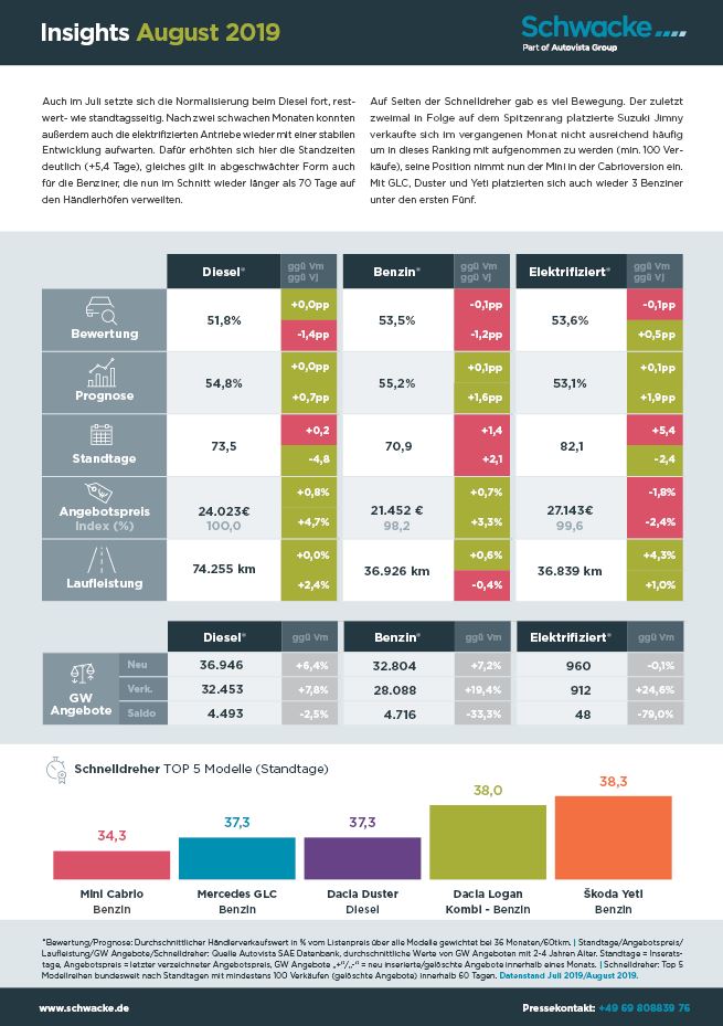Auch im Juli setzte sich die Normalisierung beim Diesel fort, restwert- wie standtagsseitig. Nach zwei schwachen Monaten konnten außerdem auch die elektrifizierten Antriebe wieder mit einer stabilen Entwicklung aufwarten. Dafür erhöhten sich hier die Standzeiten deutlich (+5,4 Tage), gleiches gilt in abgeschwächter Form auch für die Benziner, die nun im Schnitt wieder länger als 70 Tage auf den Händlerhöfen verweilten.