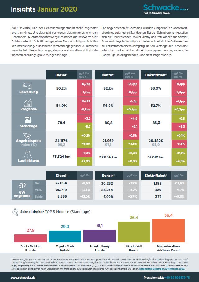 Die angebotenen Stückzahlen wurden einigermaßen absorbiert, allerdings zu längeren Standzeiten. Bei den Schnelldrehern gesellen sich die Dauerbrenner Dokker, Jimny und Yeti wieder zueinander. Aber auch Toyota Yaris Hybrid fließen schnell ab. Die A-Klasse Diesel entstammen einem Jahrgang, der die Anfänge der Dieselkrise erlebt hat und scheinbar attraktiv eingepreist wurde, sodass die Fahrzeuge im ausgehenden Jahr nicht lange standen.