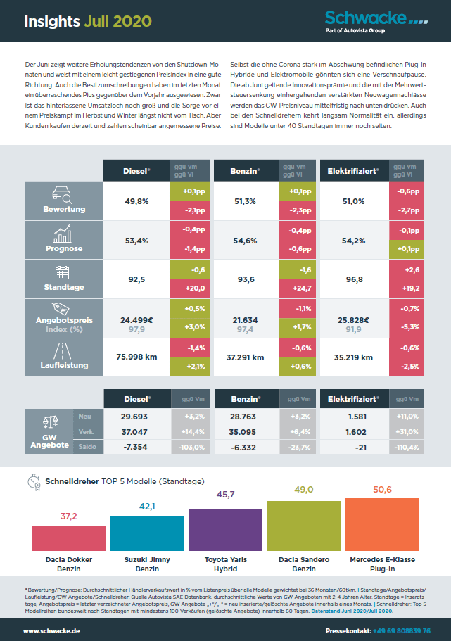 Zwar ist das hinterlassene Umsatzloch noch groß und die Sorge vor einem Preiskampf im Herbst und Winter längst nicht vom Tisch. Aber Kunden kaufen derzeit und zahlen scheinbar angemessene Preise. Selbst die ohne Corona stark im Abschwung befindlichen Plug-In Hybride und Elektromobile gönnten sich eine Verschnaufpause.