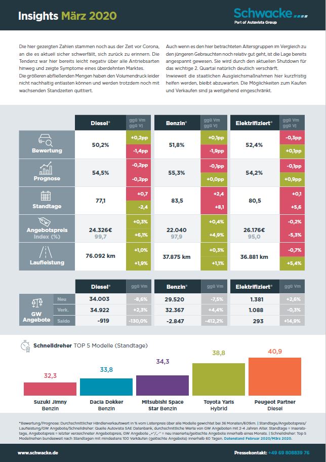 Die größeren abfließenden Mengen haben den Volumendruck leider nicht nachhaltig entlasten können und werden trotzdem noch mit wachsenden Standzeiten quittiert. Auch wenn es den hier betrachteten Altersgruppen im Vergleich zu den jüngeren Gebrauchten noch relativ gut geht, ist die Lage bereits angespannt gewesen. Sie wird durch den aktuellen Shutdown für das wichtige 2. Quartal natürlich deutlich verschärft.