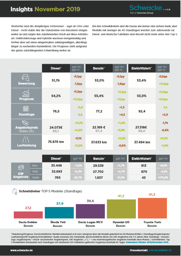 Bei den Schnelldrehern sind die Dacias wie immer eine sichere Bank, aber Modelle mit weniger als 40 Standtagen werden zum Jahresende rar. Diesel und deutsche Fabrikate sind derzeit nicht mehr unter den Top 5.
