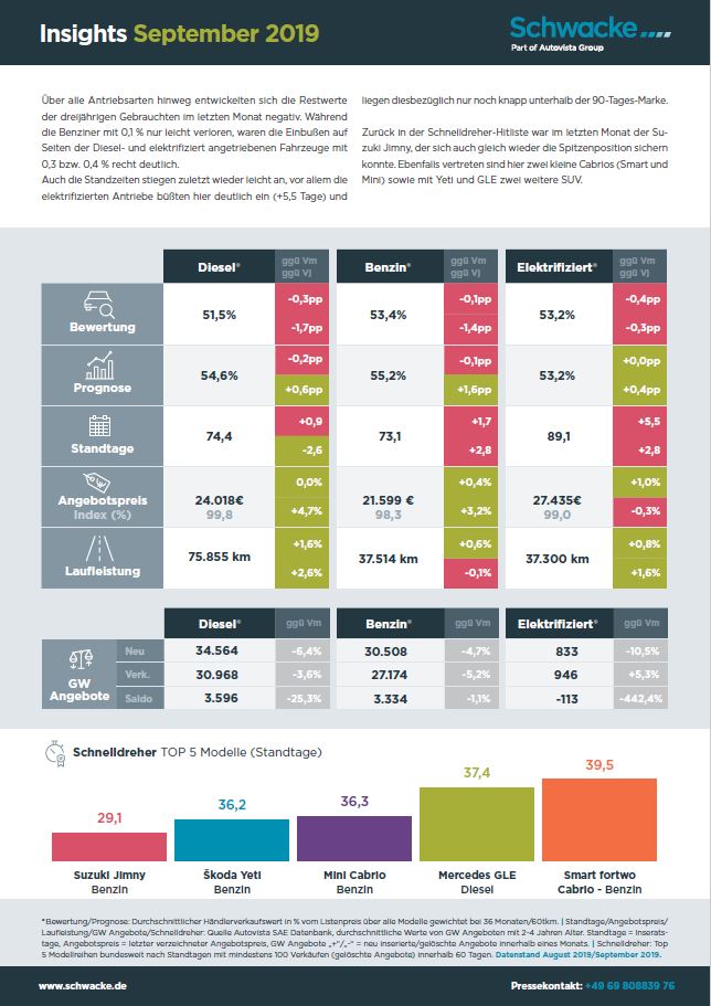 Zurück in der Schnelldreher-Hitliste war im letzten Monat der Suzuki Jimny, der sich auch gleich wieder die Spitzenposition sichern konnte. Ebenfalls vertreten sind hier zwei kleine Cabrios (Smart und Mini) sowie mit Yeti und GLE zwei weitere SUV.