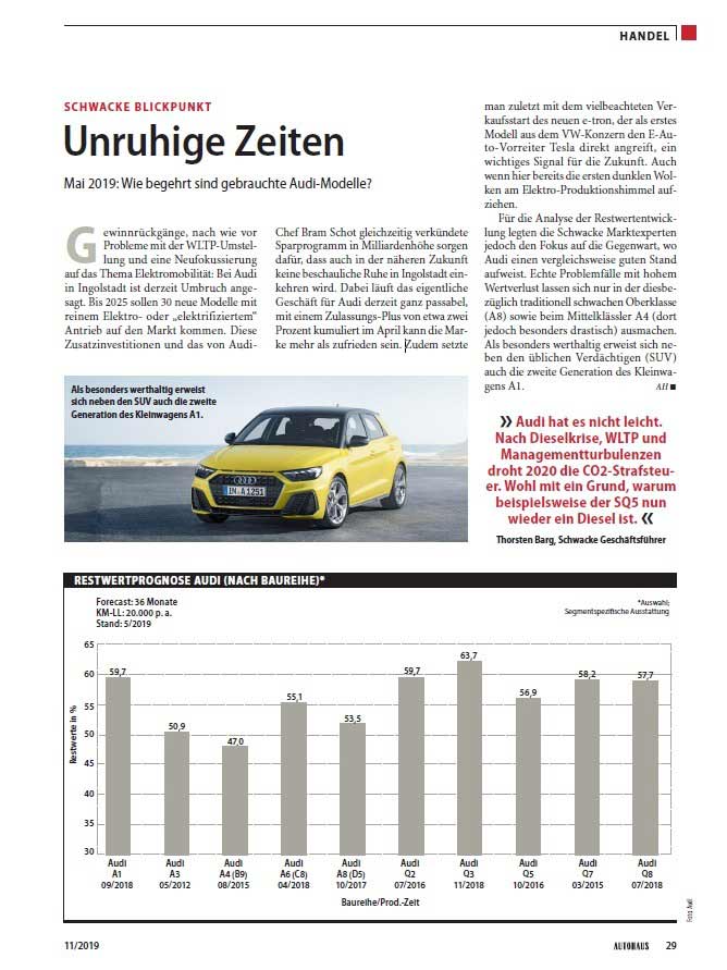 In der aktuellen Print-Ausgabe der Zeitschrift AUTOHAUS 11/2019 wurden die Restwerte einiger Audi-Modelle unter die Lupe genommen: