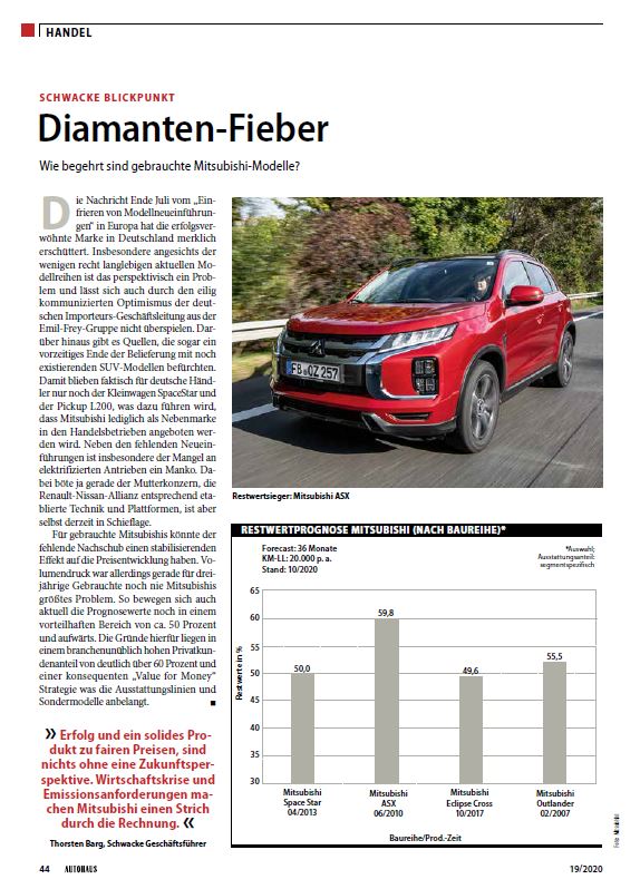 In der aktuellen Print-Ausgabe der Zeitschrift AUTOHAUS 19/2020 wurden die Restwerte einiger Mitsubishi-Modelle unter die Lupe genommen: