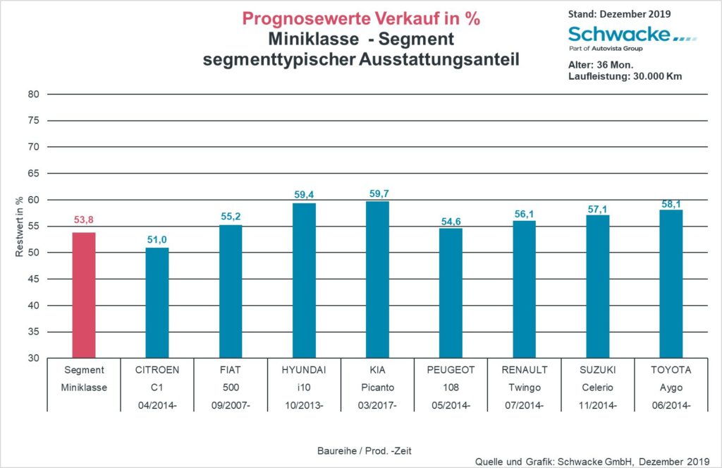 Wie sich dieses Thema auf die Wertentwicklung auswirken wird, muss die Zukunft weisen. Aktuell sind jedenfalls, wie die Schwacke Restwertprognose vorrechnet, zum Teil richtige Restwert-Könner unter den Minis, die als Dreijährige nahe 60 Prozent im Verkauf verortet werden. Die Tabellenspitze bei den untersuchten Modellen übernimmt dabei mit dem Kia Picanto ein weniger bekannter aber beliebter Asiate in diesem Segment. Ihm kommen nicht nur das vergleichsweise jugendliche Baureihenalter, sondern auch die Siebenjahres-Garantie zugute. Dass die Koreaner inzwischen auf der Überholspur fahren, zeigt das Schwestermodell Hyundai i10 auf dem zweiten Platz, weit vor den europäischen Wettbewerbern. Einen interessanten Einblick zum Thema Restwertstabilität gewähren die Drillinge Citroën C1, Peugeot 108 und Toyota Aygo. Obwohl baugleich und mit identischer Technik bestückt, kann der Toyota auf Platz 3 ganz vorne mitmischen, während der C1 das Schlusslicht markiert. Der letztlichendliche Preis für Nachlässe, also der Einfluss der Vertriebspolitik im Neuwagengeschäft wird hier sehr deutlich.