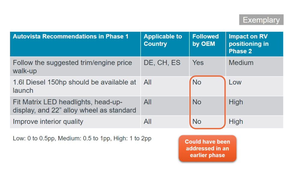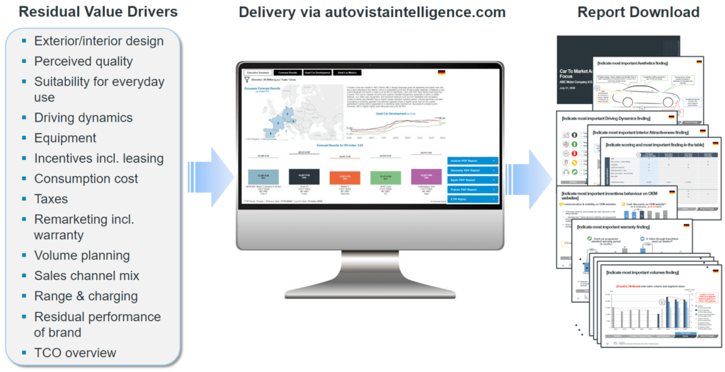 Basierend auf der finalen Produkt- und Vertriebsstrategie erstellt unser Car To Market Team eine detaillierte Restwertprognose für alle relevanten Fahrzeugversionen, einschließlich verschiedener Antriebsarten und Ausstattungsvarianten. Diese umfassende Benchmark-Analyse können Sie zu Gesprächen mit allen Stakeholdern heranziehen, die ein Asset Risiko für Ihre Fahrzeugen tragen.